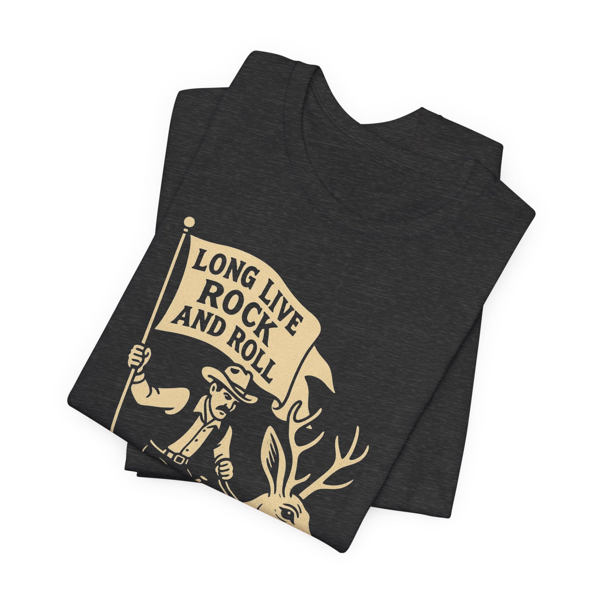 This lightweight jersey tee carries a vintage-rock spirit with a soft, faded graphic of a rider on a stag holding a flag that reads “Long Live Rock and Roll.” Breathable Airlume combed cotton gives it a broken-in feel from the first wear, while the retail fit and crew neckline keep the silhouette tidy enough to layer under a denim jacket or wear solo. The muted, single-color print feels retro and worn rather than loud — it settles into your wardrobe and becomes the tee you reach for when you want to feel easy, spirited, and a little rebellious. Wear it to backyard shows, road trips at dusk, or slow afternoons at a record shop — it’s the kind of shirt that ages into memory with you.